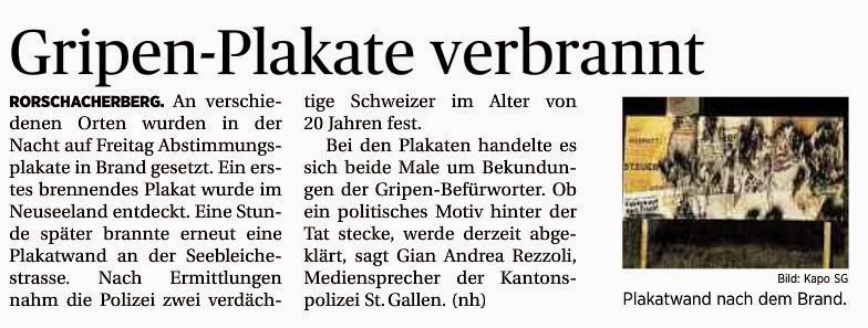 Die Meldung im Tagblatt irritiert mich. Meiner Meinung nach handelt es sich bei den angezündeten Plakatwänden um solche der Initiaten der Plus-Minus-Initiative und nicht um solche wegen dem Gripen-Kauf. Sicher bei der Brandstiftung an der Churerstrasse im Bereich Schlachthof waren es die Plakate der Plus-Minus-Initiative, die in Brand gesteckt wurden. Bild 2 und 3 habe ich am Osterwochenende geschossen, das letzte Bild gestern. Und der Standort ist derselbe.
