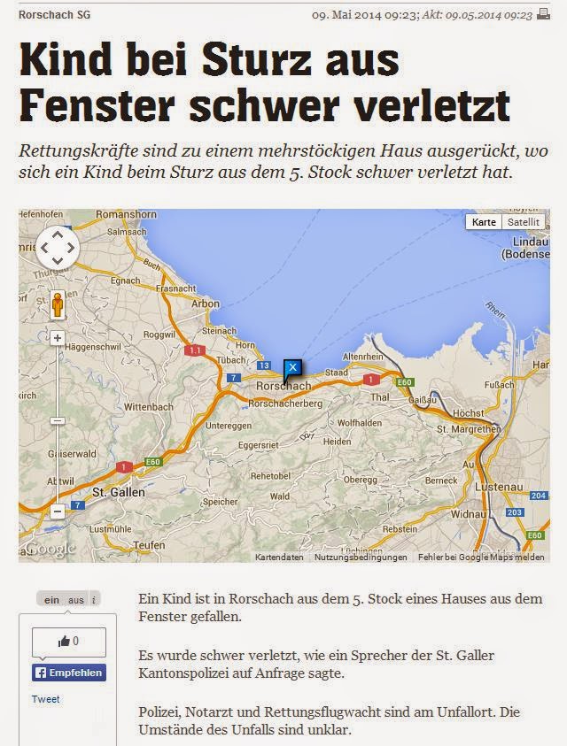 Tragischer Unfall heute morgen in Rorschach. Ein Kind ist aus dem 5. Stock gefallen. Der direkte Link zur 20 Minuten-Info >> http://www.20min.ch/schweiz/ostschweiz/story/Kind-bei-Sturz-aus-Fenster-schwer-verletzt-28485851
