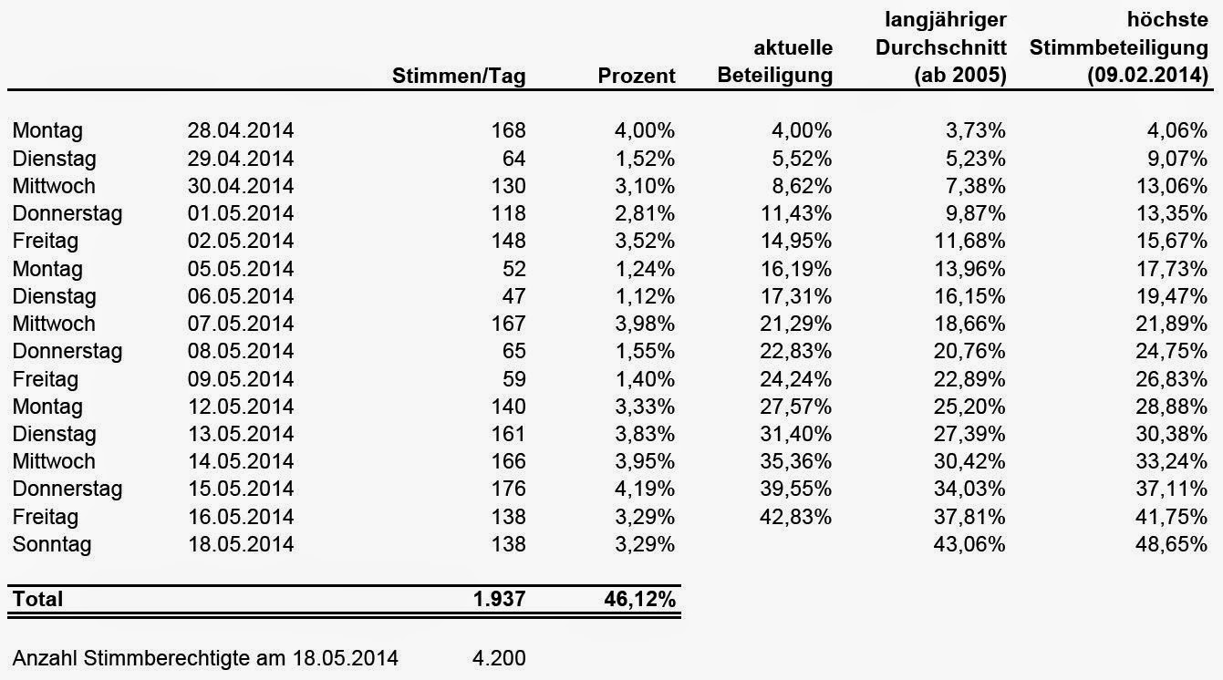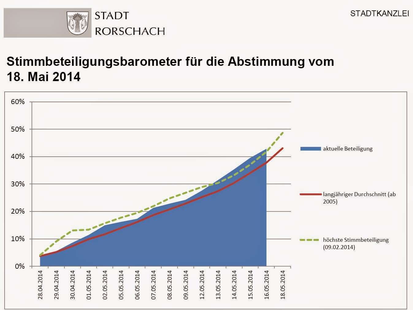 In den Briefkasten beim Rathaus! 17. Mai 2014 - 03:32Es zeichnet sich wirklich eine wahrscheinlich sogar über 50 %ige Stimmbeteiligung in Rorschach ab. Nöd schlächt!!Wichtig: Wer noch nicht abgestimmt hat darf nur noch den Briefkasten beim Rathaus verwenden. Morgen Mittag ist dann endgültig Schluss.Teilen mit: Einen Link per E-Mail an einen Freund senden (Wird in neuem Fenster geöffnet) E-Mail Drucken (Wird in neuem Fenster geöffnet) Drucken Auf Facebook teilen (Wird in neuem Fenster geöffnet) Facebook Auf X teilen (Wird in neuem Fenster geöffnet) X Auf WhatsApp teilen (Wird in neuem Fenster geöffnet) WhatsApp Gefällt mir:Gefällt mir Wird geladen …Newsletter abonnieren Bitte dieses Feld leer lassenBitte wähle, ob Du über jeden neuen Beitrag sofort oder lieber jeden Morgen gegen 9 Uhr eine Zusammenfassung der neusten Beiträge erhalten möchtest.Liste(n) auswählen: Neues vom Echo (Zusammenfassung) Neues vom Echo (Sofortbenachrichtigung) Dieses Feld wird benötigt.Prüfen Sie Ihren Posteingang und den Spamordner, um Ihr Abonnement zu bestätigen.