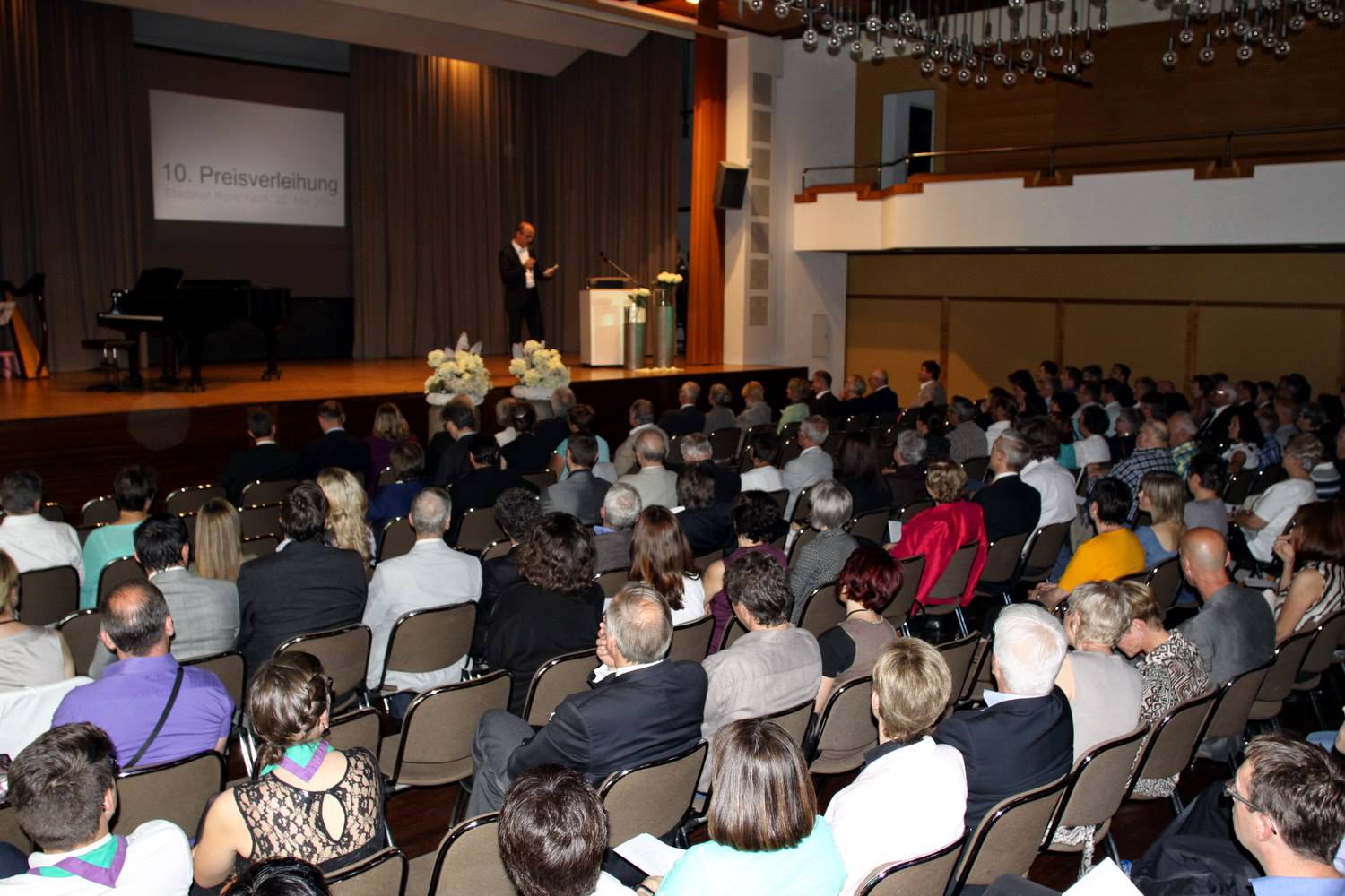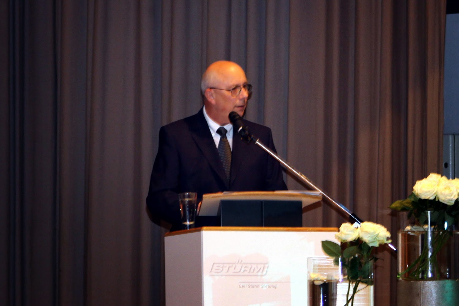In seiner Grussbotschaft wies Stiftungsratspräsident Peter Thomas (Peter Thoma und Preisträger Peter Thoma heissen wohl gleich, sind aber nicht miteinander verwandt) darauf hin, dass die Carl Stürm Stiftung sich vor 10 Jahren zum Ziel gesetzt hat, einen Beitrag zur wirtschaftlichen und kulturellen Aufwertung der Region Rorschach zu leisten. Fein wie eine Feder und scharf wie eine Rasierklinge hat er auch den Ausgang der Abstimmung vom letzten Sonntag kommentiert. Als er mit den Worten „Ich danke für ihr demokratisches Entgegenkommen, dass ich als Vertreter einer Minderheit meine Meinung öffentlich äussern durfte“ seine Ansprache beendete, erhielt er tosenden Applaus.