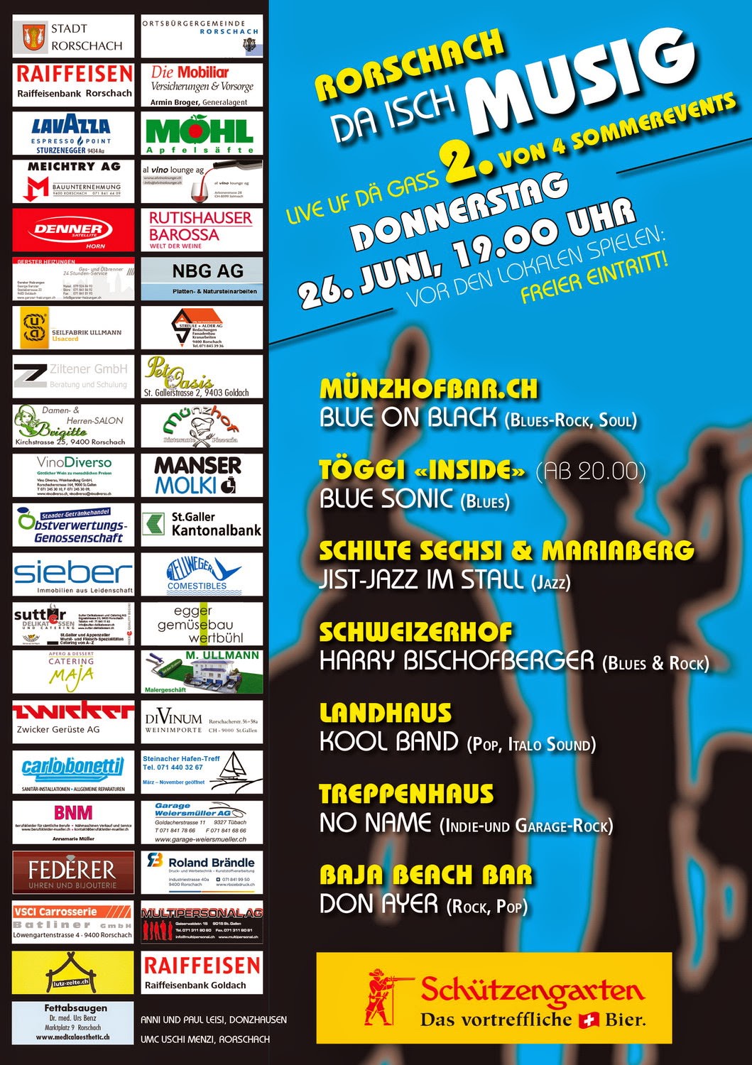 Da hät gfäget !! 29. Mai 2014 - 08:00Impressionen vom ersten Event von Musig uf de Gass. Die Bilder wurden von Sven Sutter geschossen. Herzlichen Dank. Und hier bereits der Hinweis auf die zweite Durchführung am 26. Juni.Teilen mit: Einen Link per E-Mail an einen Freund senden (Wird in neuem Fenster geöffnet) E-Mail Drucken (Wird in neuem Fenster geöffnet) Drucken Auf Facebook teilen (Wird in neuem Fenster geöffnet) Facebook Auf X teilen (Wird in neuem Fenster geöffnet) X Auf WhatsApp teilen (Wird in neuem Fenster geöffnet) WhatsApp Gefällt mir:Gefällt mir Wird geladen …Newsletter abonnieren Bitte dieses Feld leer lassenBitte wähle, ob Du über jeden neuen Beitrag sofort oder lieber jeden Morgen gegen 9 Uhr eine Zusammenfassung der neusten Beiträge erhalten möchtest.Liste(n) auswählen: Neues vom Echo (Zusammenfassung) Neues vom Echo (Sofortbenachrichtigung) Dieses Feld wird benötigt.Prüfen Sie Ihren Posteingang und den Spamordner, um Ihr Abonnement zu bestätigen.