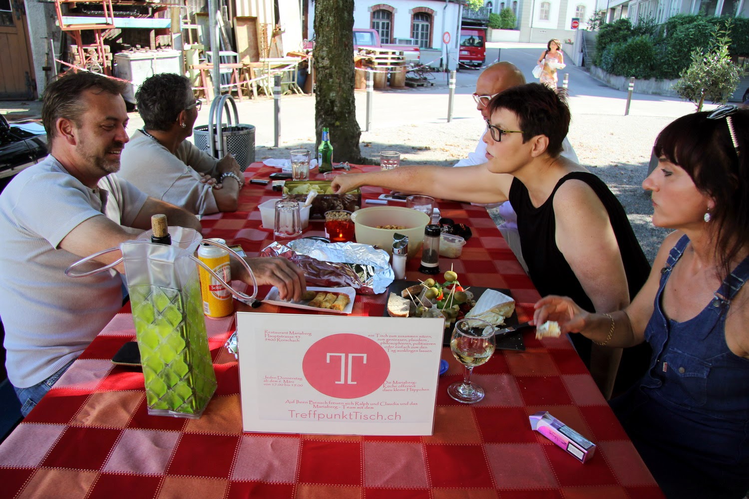 Leute, die sich an lieb gewonnene Traditionen gewöhnt haben, lassen sich nicht einfach wegen Ferienabwesenheit der Stammbeizer von ihren donnerstäglichen Gepflogenheiten abhalten … So hat der TreffpunktTisch auf dem Lindenplatz fast noch mehr Spass gemacht. Und an Improvisationstalent kann man sich von dieser Truppe was abschneiden!!