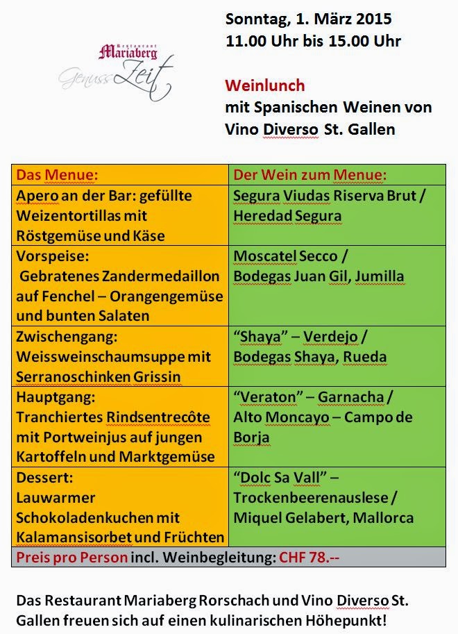 Ab 11 Uhr findet im Restaurant Mariaberg ein Weinlunch der ganz speziellen Art statt. Die Rorschacherin Anita Price von Vino Diverso St. Gallen wird zusammen mit ihrem Geschäftspartner Weine aus Spanien präsentieren und aus der Mariabergküche gibt es die dazu passenden Speisen. Man gönnt sich ja sonst nichts …
