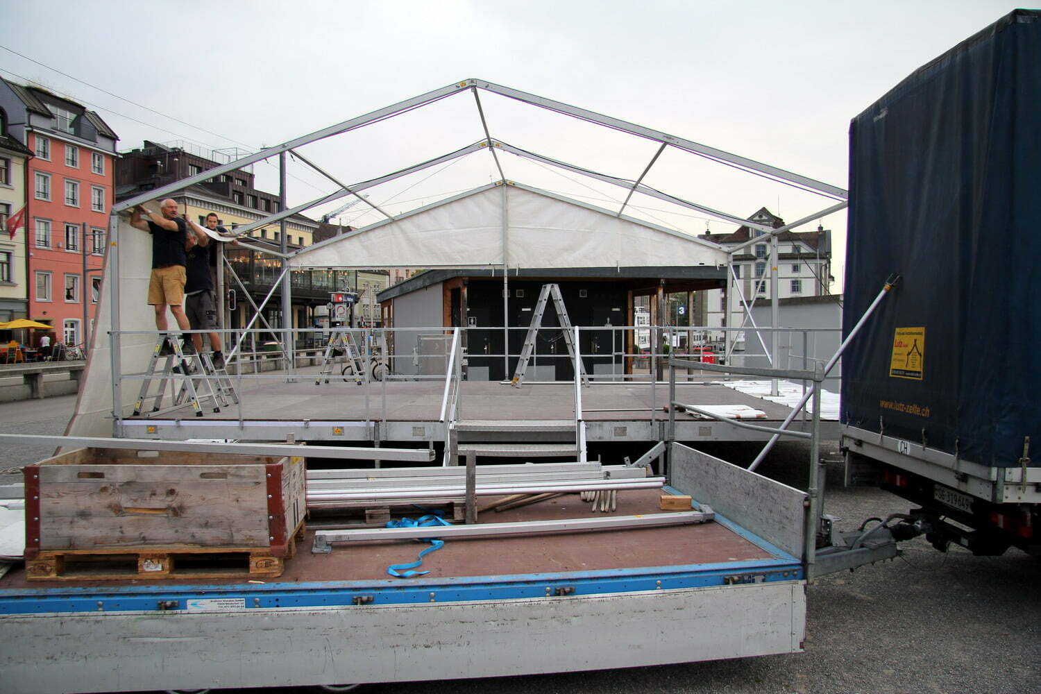 Strom vorhanden, WC-Türen geflickt, Bühne aufgebaut. Heute werden die einzelnen Festzelte der Vereine gestellt. Morgen dann die Feinarbeiten und dann geht es um 19 Uhr los. Freude herrscht.