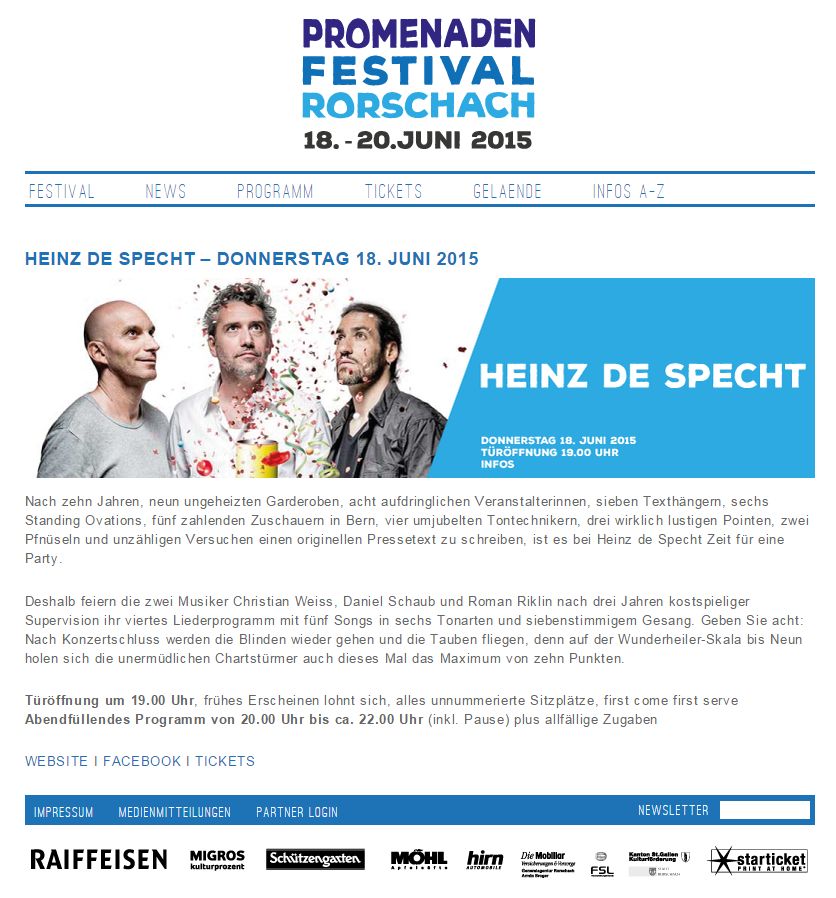 Ab Donnerstag in der Badhütte 16. Juni 2015 - 04:00Von Donnerstag bis und mit Samstag wird anlässlich des Promenaden Festivals in der Rorschacher Badhütte einiges geboten >> Das erwartet das Publikum am Donnerstag:Teilen mit: Einen Link per E-Mail an einen Freund senden (Wird in neuem Fenster geöffnet) E-Mail Drucken (Wird in neuem Fenster geöffnet) Drucken Auf Facebook teilen (Wird in neuem Fenster geöffnet) Facebook Auf X teilen (Wird in neuem Fenster geöffnet) X Auf WhatsApp teilen (Wird in neuem Fenster geöffnet) WhatsApp Gefällt mir:Gefällt mir Wird geladen …Newsletter abonnieren Bitte dieses Feld leer lassenBitte wähle, ob Du über jeden neuen Beitrag sofort oder lieber jeden Morgen gegen 9 Uhr eine Zusammenfassung der neusten Beiträge erhalten möchtest.Liste(n) auswählen: Neues vom Echo (Zusammenfassung) Neues vom Echo (Sofortbenachrichtigung) Dieses Feld wird benötigt.Prüfen Sie Ihren Posteingang und den Spamordner, um Ihr Abonnement zu bestätigen.