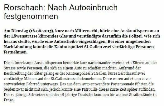 Immerhin hat man sie erwischt … 16. Juni 2015 - 08:23>> http://www.kapo.sg.ch/news/kapo/2015/06/rorschach–nach-autoeinbruch-festgenommen.htmlTeilen mit: Einen Link per E-Mail an einen Freund senden (Wird in neuem Fenster geöffnet) E-Mail Drucken (Wird in neuem Fenster geöffnet) Drucken Auf Facebook teilen (Wird in neuem Fenster geöffnet) Facebook Auf X teilen (Wird in neuem Fenster geöffnet) X Auf WhatsApp teilen (Wird in neuem Fenster geöffnet) WhatsApp Gefällt mir:Gefällt mir Wird geladen …Newsletter abonnieren Bitte dieses Feld leer lassenBitte wähle, ob Du über jeden neuen Beitrag sofort oder lieber jeden Morgen gegen 9 Uhr eine Zusammenfassung der neusten Beiträge erhalten möchtest.Liste(n) auswählen: Neues vom Echo (Zusammenfassung) Neues vom Echo (Sofortbenachrichtigung) Dieses Feld wird benötigt.Prüfen Sie Ihren Posteingang und den Spamordner, um Ihr Abonnement zu bestätigen.