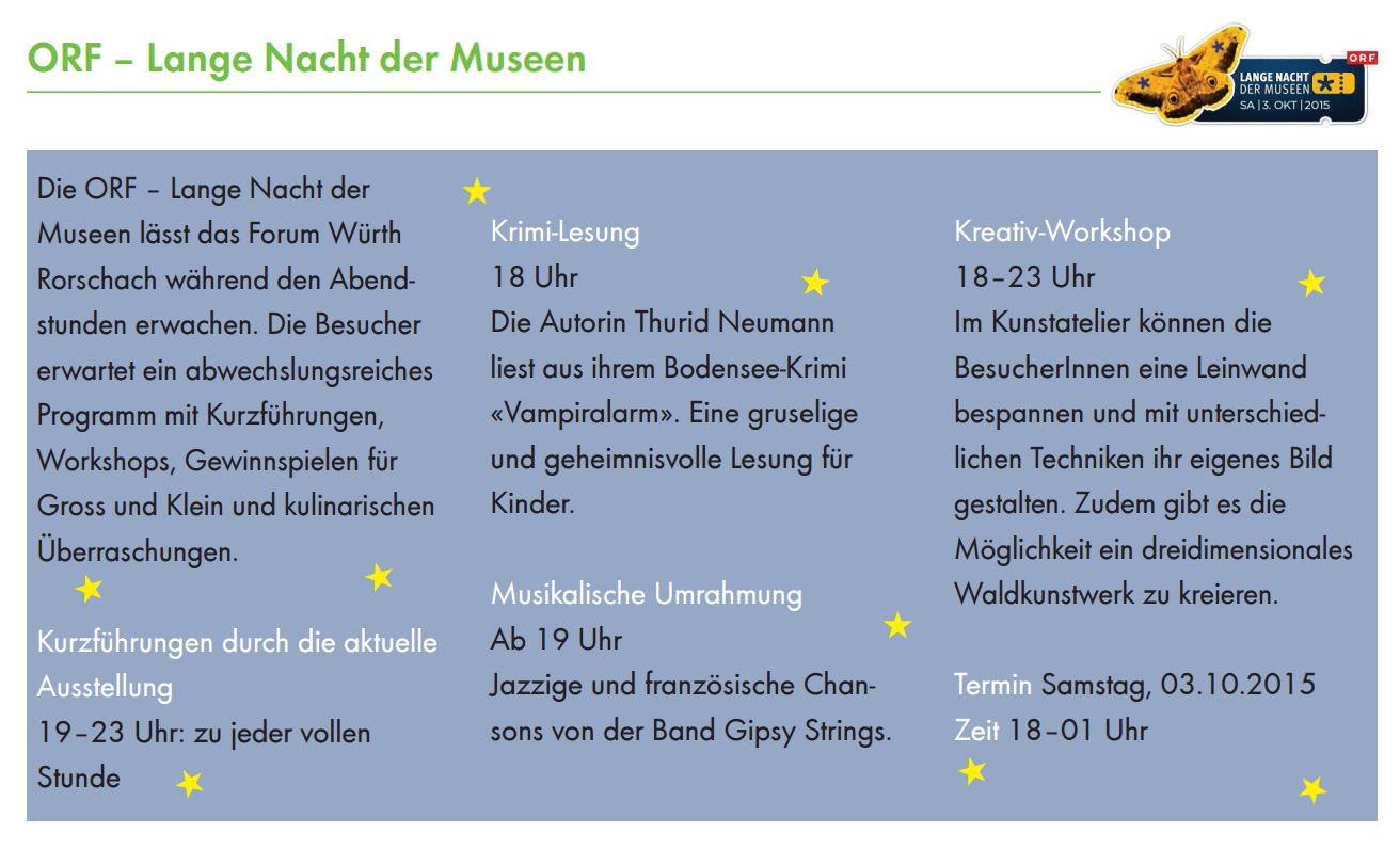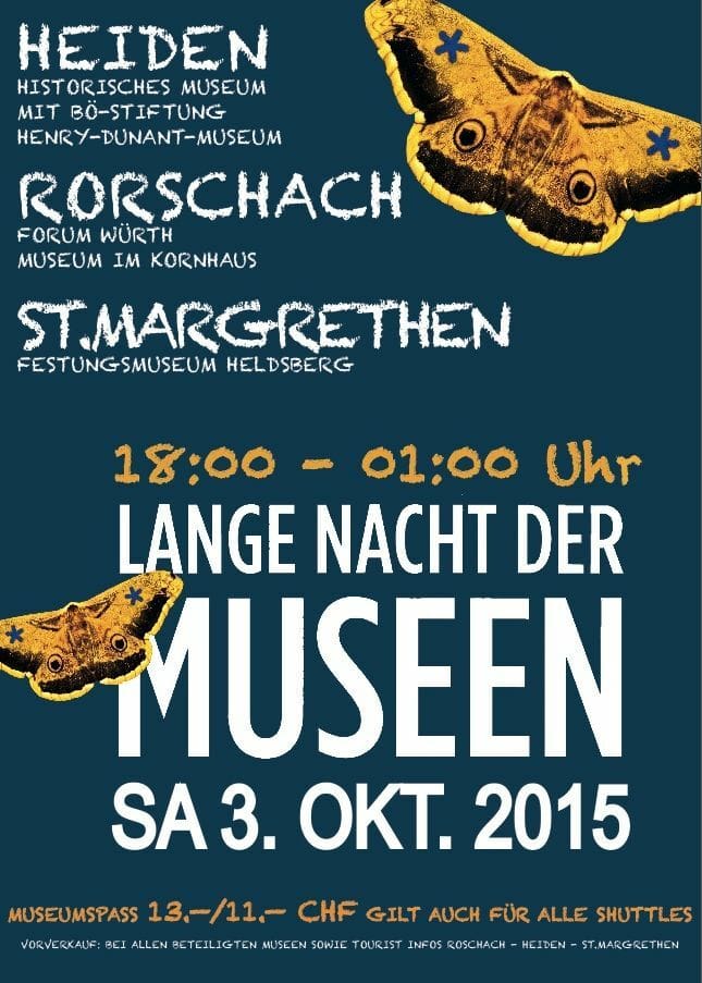 Auf an die Museumsnacht 3. Oktober 2015 - 04:10Heute ab 18 Uhr. In Rorschach im Museum im Kornhaus und im Forum Würth. Je nach Verlauf gibt es morgen auf diesem Blog einige Bilder zu sehen.Teilen mit: Einen Link per E-Mail an einen Freund senden (Wird in neuem Fenster geöffnet) E-Mail Drucken (Wird in neuem Fenster geöffnet) Drucken Auf Facebook teilen (Wird in neuem Fenster geöffnet) Facebook Auf X teilen (Wird in neuem Fenster geöffnet) X Auf WhatsApp teilen (Wird in neuem Fenster geöffnet) WhatsApp Gefällt mir:Gefällt mir Wird geladen …Newsletter abonnieren Bitte dieses Feld leer lassenBitte wähle, ob Du über jeden neuen Beitrag sofort oder lieber jeden Morgen gegen 9 Uhr eine Zusammenfassung der neusten Beiträge erhalten möchtest.Liste(n) auswählen: Neues vom Echo (Zusammenfassung) Neues vom Echo (Sofortbenachrichtigung) Dieses Feld wird benötigt.Prüfen Sie Ihren Posteingang und den Spamordner, um Ihr Abonnement zu bestätigen.