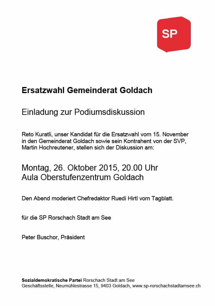 Echli über d’Grenze güxlet … 26. Oktober 2015 - 04:22Podiumsdiskussion in Goldach betreffend der anstehenden Ersatzwahl in den Gemeinderat.Teilen mit: Einen Link per E-Mail an einen Freund senden (Wird in neuem Fenster geöffnet) E-Mail Drucken (Wird in neuem Fenster geöffnet) Drucken Auf Facebook teilen (Wird in neuem Fenster geöffnet) Facebook Auf X teilen (Wird in neuem Fenster geöffnet) X Auf WhatsApp teilen (Wird in neuem Fenster geöffnet) WhatsApp Gefällt mir:Gefällt mir Wird geladen …Newsletter abonnieren Bitte dieses Feld leer lassenBitte wähle, ob Du über jeden neuen Beitrag sofort oder lieber jeden Morgen gegen 9 Uhr eine Zusammenfassung der neusten Beiträge erhalten möchtest.Liste(n) auswählen: Neues vom Echo (Zusammenfassung) Neues vom Echo (Sofortbenachrichtigung) Dieses Feld wird benötigt.Prüfen Sie Ihren Posteingang und den Spamordner, um Ihr Abonnement zu bestätigen.