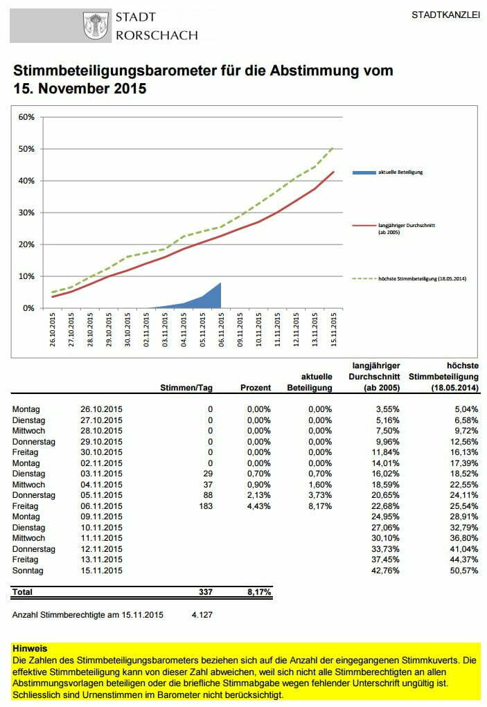 Okay. die Abstimmungs- und Wahlunterlagen wurden auch erst anfangs Woche verteilt. Mal schauen. >> Guckstdu da >> http://www.rorschach.ch/media/pdf/wahlresultate/Abstimmungsbarometer/Abstimmungsbarometer_151115.pdf