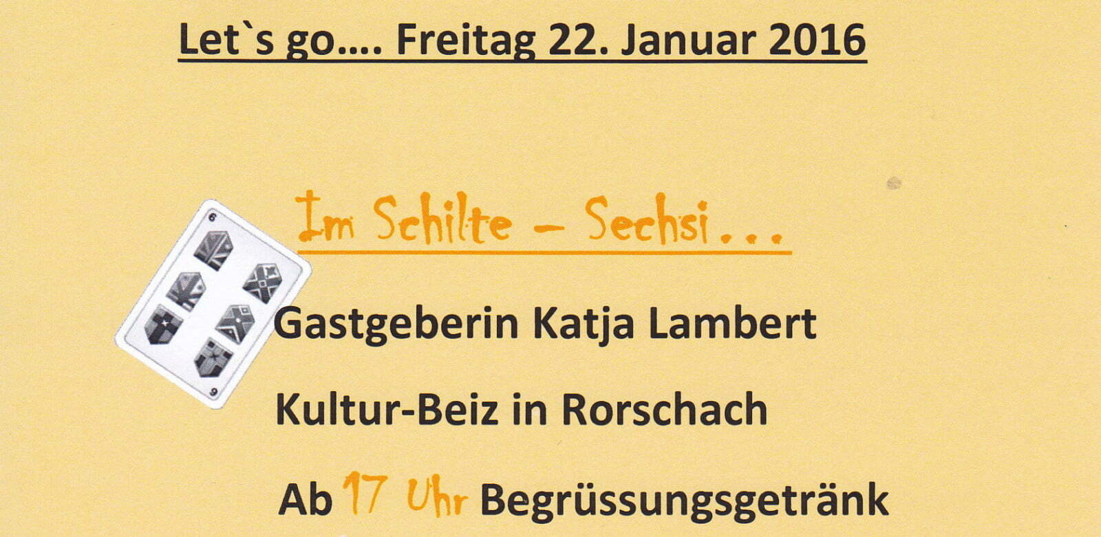 Die Flyer sind verteilt – es kann los gehen …Themen:BeizenRorschach 22. Januar 2016 - 06:22Heute um 17 Uhr beginn für Katja Lambert das Abenteuer Schilte Sechsi auf dem Lindenplatz. Und so wie es sich gehört mit einem Begrüssungsgetränk und feiner Musik im Hintergrund.Teilen mit: Klicken, um einem Freund einen Link per E-Mail zu senden (Wird in neuem Fenster geöffnet) E-Mail Klicken zum Ausdrucken (Wird in neuem Fenster geöffnet) Drucken Klick, um auf Facebook zu teilen (Wird in neuem Fenster geöffnet) Facebook Klicke, um auf X zu teilen (Wird in neuem Fenster geöffnet) X Klicken, um auf WhatsApp zu teilen (Wird in neuem Fenster geöffnet) WhatsApp Gefällt mir:Gefällt mir Wird geladen …Newsletter abonnieren Bitte dieses Feld leer lassenBitte wähle, ob Du über jeden neuen Beitrag sofort oder lieber jeden Morgen gegen 9 Uhr eine Zusammenfassung der neusten Beiträge erhalten möchtest.Liste(n) auswählen: Neues vom Echo (Zusammenfassung) Neues vom Echo (Sofortbenachrichtigung) Dieses Feld wird benötigt.Prüfen Sie Ihren Posteingang und den Spamordner, um Ihr Abonnement zu bestätigen.
