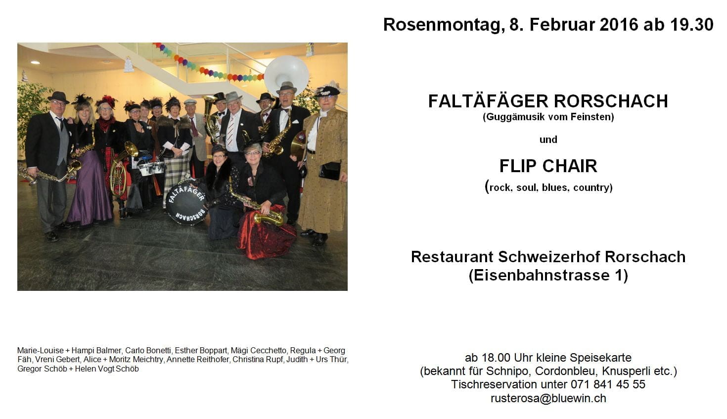 Heute grosser Rosenmontagsball im SchweizerhofThemen:BeizenRorschach 8. Februar 2016 - 05:43Heute ab 19.30 Uhr. Abwechslungsweise sorgen die Faltäfäger und Flip-chair für Stimmung.Teilen mit: Einen Link per E-Mail an einen Freund senden (Wird in neuem Fenster geöffnet) E-Mail Drucken (Wird in neuem Fenster geöffnet) Drucken Auf Facebook teilen (Wird in neuem Fenster geöffnet) Facebook Auf X teilen (Wird in neuem Fenster geöffnet) X Auf WhatsApp teilen (Wird in neuem Fenster geöffnet) WhatsApp Gefällt mir:Gefällt mir Wird geladen …Newsletter abonnieren Bitte dieses Feld leer lassenBitte wähle, ob Du über jeden neuen Beitrag sofort oder lieber jeden Morgen gegen 9 Uhr eine Zusammenfassung der neusten Beiträge erhalten möchtest.Liste(n) auswählen: Neues vom Echo (Zusammenfassung) Neues vom Echo (Sofortbenachrichtigung) Dieses Feld wird benötigt.Prüfen Sie Ihren Posteingang und den Spamordner, um Ihr Abonnement zu bestätigen.
