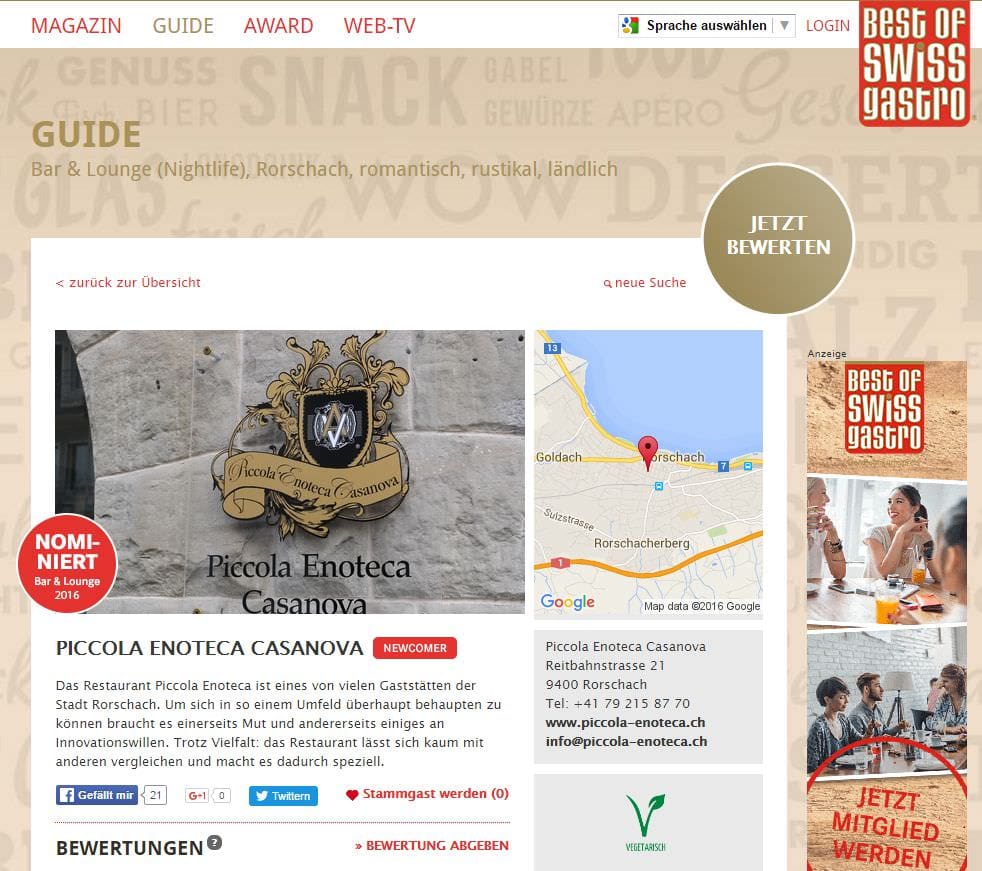 Die Piccola Enoteca an der Reitbahnstrasse 21 ist für „Best of Swiss Gastro“ nominiert. Da stellt sich eine der kleineren Lokalitäten der Stadt einer grossen Herausforderung. Und alle RorschahcerInnen können Bernadette Casnavoa dabei tatkräftig unterstützen. Hier kommt man direkt zum Bewertungsteil. Und natürlich gibt es das Ganze auch als Flyer in der Enoteca, die heute wieder ab 17 Uhr geöffnet hat.
