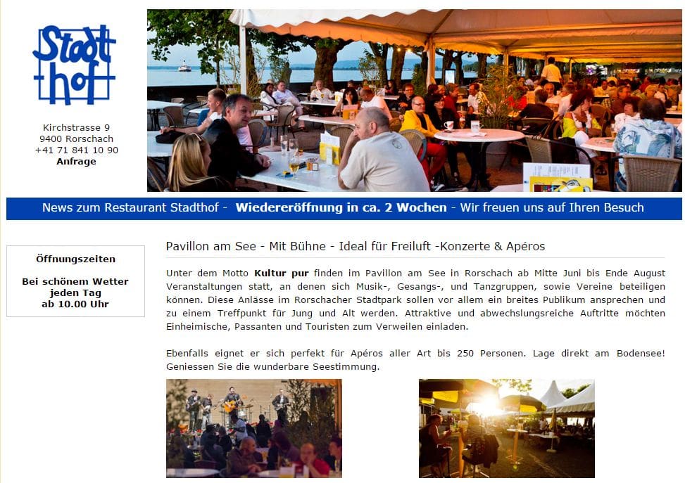 Stadthof soll in ca. 2 Wochen wieder öffnenThemen:BeizenRorschach 10. August 2016 - 06:02Das mit der geplanten Wiedereröffnung im Stadthof ist gemäss Homepage in gut 14 Tagen geplant. Mittlerweile ist im Netz auch bekannt geworden, wo die Vorgänger jetzt wirken.Teilen mit: Einen Link per E-Mail an einen Freund senden (Wird in neuem Fenster geöffnet) E-Mail Drucken (Wird in neuem Fenster geöffnet) Drucken Auf Facebook teilen (Wird in neuem Fenster geöffnet) Facebook Auf X teilen (Wird in neuem Fenster geöffnet) X Auf WhatsApp teilen (Wird in neuem Fenster geöffnet) WhatsApp Gefällt mir:Gefällt mir Wird geladen …Newsletter abonnieren Bitte dieses Feld leer lassenBitte wähle, ob Du über jeden neuen Beitrag sofort oder lieber jeden Morgen gegen 9 Uhr eine Zusammenfassung der neusten Beiträge erhalten möchtest.Liste(n) auswählen: Neues vom Echo (Zusammenfassung) Neues vom Echo (Sofortbenachrichtigung) Dieses Feld wird benötigt.Prüfen Sie Ihren Posteingang und den Spamordner, um Ihr Abonnement zu bestätigen.