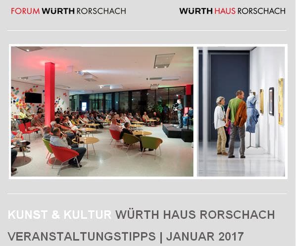 Viel Kunst und Kultur im Würth-Haus RorschachThemen:KulturRorschachWürth 18. Dezember 2016 - 06:35Das Veranstaltungsprogramm für den Januar ist erschienen. Im Detail findet man es hier.Teilen mit: Einen Link per E-Mail an einen Freund senden (Wird in neuem Fenster geöffnet) E-Mail Drucken (Wird in neuem Fenster geöffnet) Drucken Auf Facebook teilen (Wird in neuem Fenster geöffnet) Facebook Auf X teilen (Wird in neuem Fenster geöffnet) X Auf WhatsApp teilen (Wird in neuem Fenster geöffnet) WhatsApp Gefällt mir:Gefällt mir Wird geladen …Newsletter abonnieren Bitte dieses Feld leer lassenBitte wähle, ob Du über jeden neuen Beitrag sofort oder lieber jeden Morgen gegen 9 Uhr eine Zusammenfassung der neusten Beiträge erhalten möchtest.Liste(n) auswählen: Neues vom Echo (Zusammenfassung) Neues vom Echo (Sofortbenachrichtigung) Dieses Feld wird benötigt.Prüfen Sie Ihren Posteingang und den Spamordner, um Ihr Abonnement zu bestätigen.