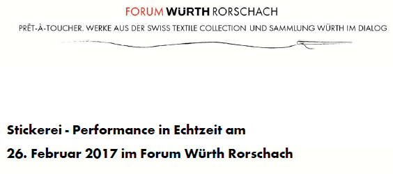 Das Handwerk der Stickerei ist so anspruchsvoll wie vielseitig. Heute ist es jedoch nahezu in Vergessenheit geraten und von Maschinen ersetzt. Am kommenden Sonntag, 26. Februar 2017, findet anlässlich des letzten Tages der Ausstellung «Prêt-à-toucher – Werke aus der Swiss Textile Collection und Sammlung Würth im Dialog» eine eindrückliche Stickerei-Performance der Appenzeller Handstickerin Verena Schiegg, dem Textilkünstler André Wilhelm und der Appenzeller Traditions-Stickerei Eisenhut statt. Besucher können das Textilhandwerk ab 13.00 Uhr in Echtzeit erleben.