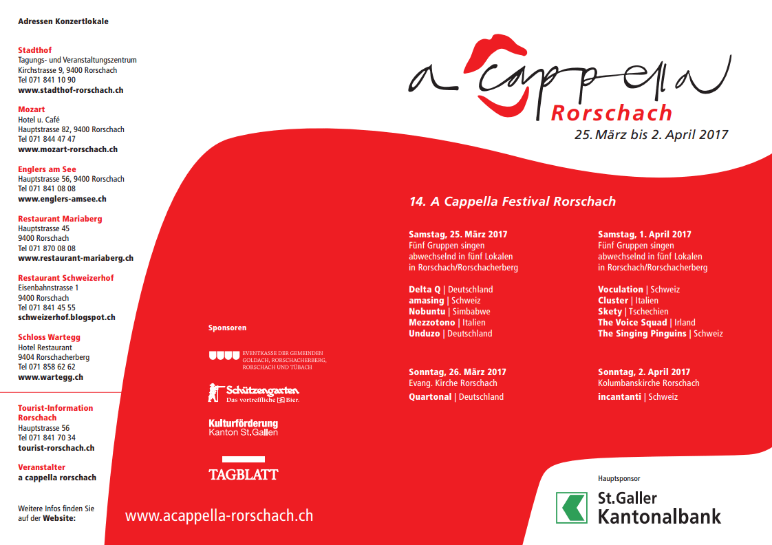 Heute (und morgen in der Evangelischen Kirche) und dann nochmals in einer Woche. Dann ist Schluss. Mehr Infos zum Gesamtangebot gibt es hier. Man sollte sich aber vorher in den mitmachenden Restaurants erkundigen, ob überhaupt noch Platz vorhanden ist. Und was acappella auch sein kann beweist ja das obige Video. Ein Klassiker, made in Kuba. Wunderbar. Aber nicht in Rorschach.