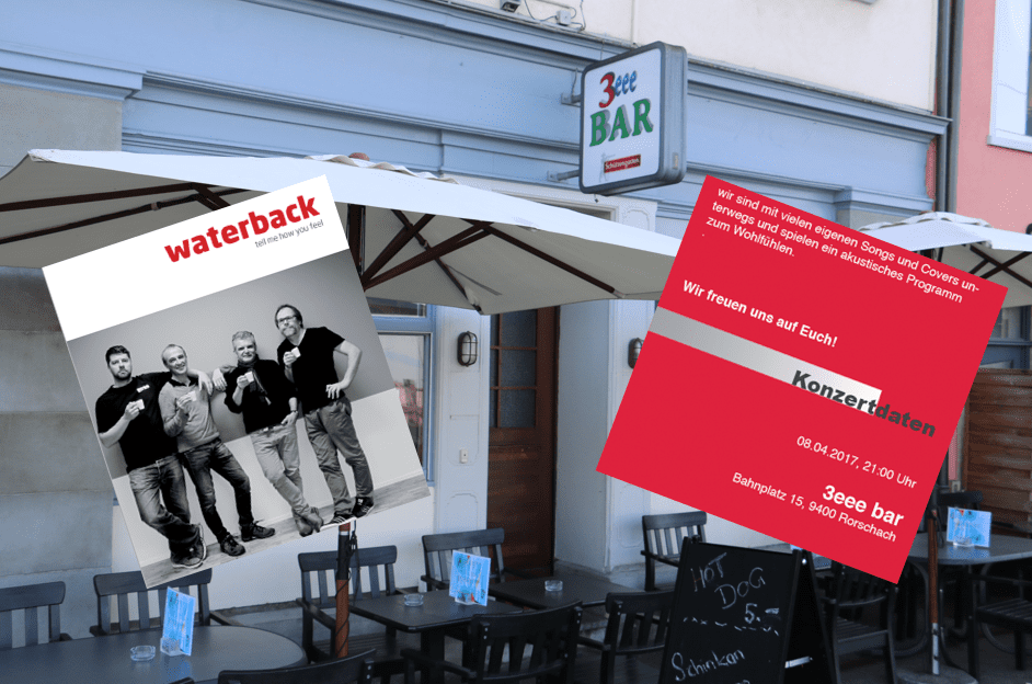 Konzert von Waterback am kommenden Samstagabend, 8. April in der 3eee-Bar beim Hafenbahnhof. Waterback bestehen (v.l.n.r.) aus Tobi Schneider, Oswaldo Dolci, Massimo Natali und Andi Aeschbacher und sind mit den beiden Songs „Chatting on the net“ und „Thinking bout you“ immer wieder auf Radio Swiss Pop zu hören.