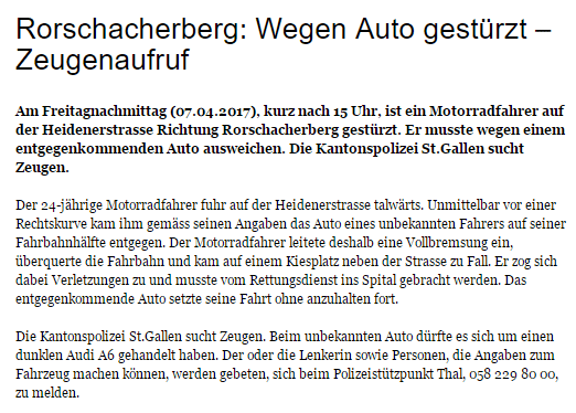 Motorradunfall – Zeugenaufruf der PolizeiThemen:Rorschacherberg 8. April 2017 - 11:27Gestern auf der Heidenerstrasse in Rorschacherberg passiert. Die Kantonspolizei sucht mögliche Zeugen.Teilen mit: Einen Link per E-Mail an einen Freund senden (Wird in neuem Fenster geöffnet) E-Mail Drucken (Wird in neuem Fenster geöffnet) Drucken Auf Facebook teilen (Wird in neuem Fenster geöffnet) Facebook Auf X teilen (Wird in neuem Fenster geöffnet) X Auf WhatsApp teilen (Wird in neuem Fenster geöffnet) WhatsApp Gefällt mir:Gefällt mir Wird geladen …Newsletter abonnieren Bitte dieses Feld leer lassenBitte wähle, ob Du über jeden neuen Beitrag sofort oder lieber jeden Morgen gegen 9 Uhr eine Zusammenfassung der neusten Beiträge erhalten möchtest.Liste(n) auswählen: Neues vom Echo (Zusammenfassung) Neues vom Echo (Sofortbenachrichtigung) Dieses Feld wird benötigt.Prüfen Sie Ihren Posteingang und den Spamordner, um Ihr Abonnement zu bestätigen.