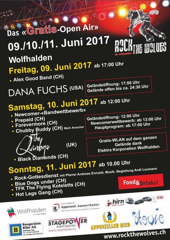 Wolfhalden lockt mit „Rock the Wolves„. Start am Freitag um 17 Uhr. Festivalende am Sonntagnachmittag. Openair-Feeling.