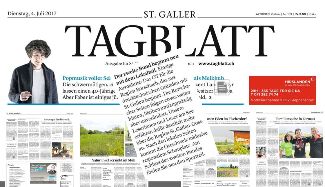 Das «St. Galler Tagblatt» stellt ab heute auf eine Zweibund-Architektur um. Damit soll der Druckprozess vereinfacht und die redaktionelle Berichterstattung gebündelt werden. Und spätestens ab heute wissen wir in der Region, dass Rorschach definitiv nicht der Nabel der Welt ist, sondern sich fein säuberlich irgendwo zwischen „St. Gallen“ und „Ostschweiz“ befindet. Das Ganze ist noch etwas gewöhnungsbedürftig. Kurz: Das Rorschacher Echo bleibt dran …