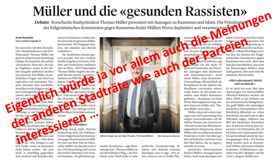 Unterschwellig stellt Thomas Müller im Tagblatt-Interview fest, dass er sein früher mehrfach unterschwellig und oberschwellig geäussertes Versprechen, auf Ende nächsten Jahres als Stadtratpäsident zurücktreten wird, aufgrund der vielen in. Rorschach unabgeschlossenen Projekte nicht halten kann. Nach diesem Interview bleibt nur eines: Alle vier anderen Stadtratsmitglieder erklären der Wählerschaft deutlich, wie sie zu Thomas Müller und seinem fremden Federnschmuck stehen. Wer ihn und seine Politik nicht unterstützen kann, sollte auf Ende des nächsten Jahres aus seinem Amt zurücktreten, wenn Thomas Müller seinerseits nicht zurücktritt. Opportunistische Karrieristen, die sich von Thomas Müller an seiner Sandstreuung in die Augen der Rorschacherinnen und Rorschacher missbrauchen lassen, brauchen wir nicht. Sollte sich aber unser Stadtrat nur noch aus demokratisch gewählten, müllerkonformen Mitgliedern bestehen, jä nusode. Wer damit nicht leben will, findet in einer steuergünstigeren Gemeinde auch schöne Häuser und auch schöne Wohnungen. Es muss ja nicht zwingend Goldach sein.