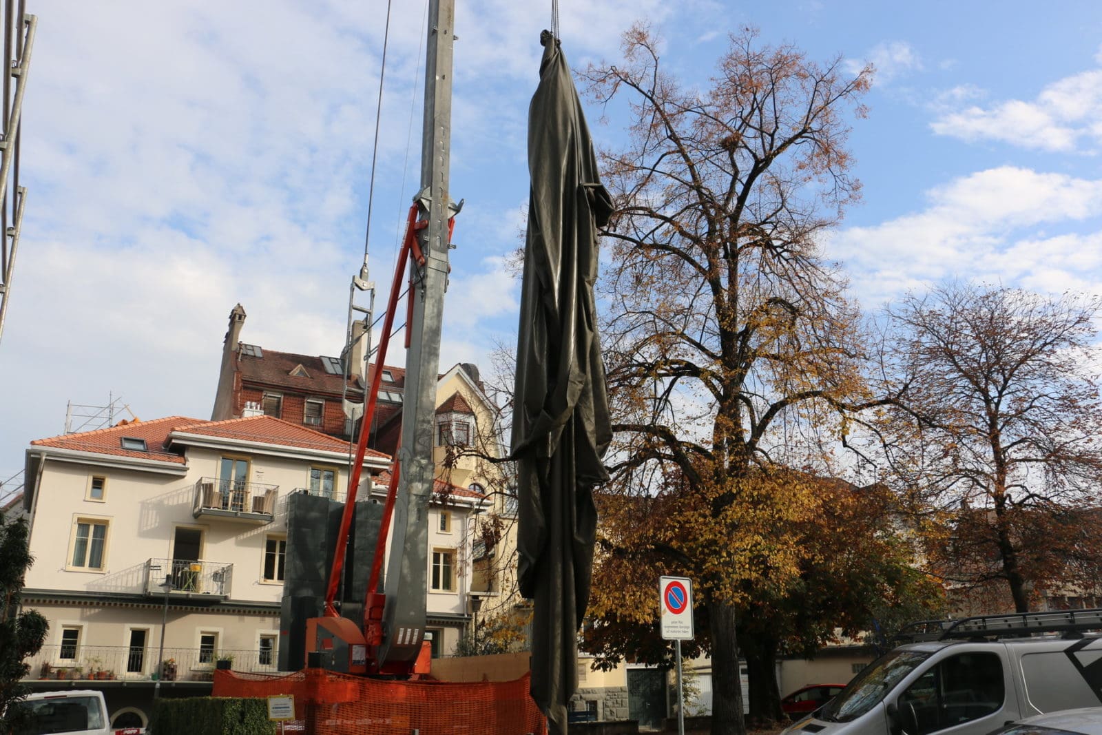Heute auf dem Lindenplatz. Keine Angst: Die Linde wird nicht eingepackt. Mit der Plache wird ein Dach abgedeckt.