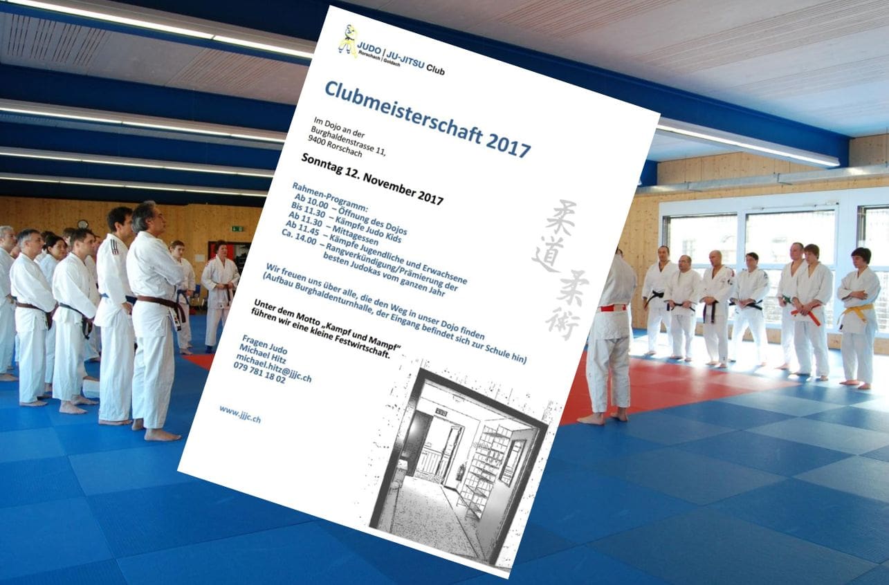 Die traditionelle Clubmeisterschaft des Judo und Ju-Jitsu Club Rorschach/Goldach findet am 12. November 2017 statt. Die Initianten führen einen kleinen Imbissstand im Dojo an der Burghaldenstrasse 11 in Rorschach. Ob Kämpfer, Judoka, Kampfkünstler, Eltern, Familienmitglieder, Bekannte oder Interessierte – alle sind am Tag der offenen Tür willkommen. Weitere Infos findet man auf der Homepage des Vereins oder auch auf der Facebookseite.