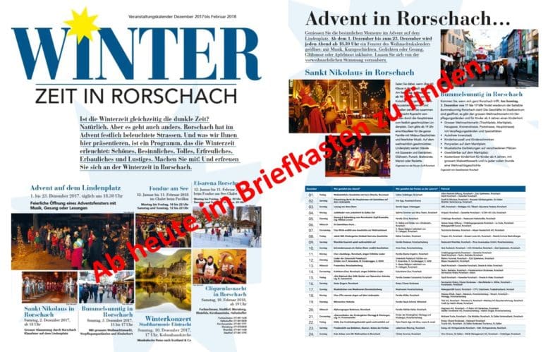 Morgen geht es wieder los …Themen:AdventKulturRorschach 30. November 2017 - 05:26… und gleich zu Beginn bekommt man in Rorschach die ganzen vorweihnachtlichen Events serviert. Die Zeitung mit allen Detailinformationen wird in die Briefkästen verteilt.Teilen mit: Einen Link per E-Mail an einen Freund senden (Wird in neuem Fenster geöffnet) E-Mail Drucken (Wird in neuem Fenster geöffnet) Drucken Auf Facebook teilen (Wird in neuem Fenster geöffnet) Facebook Auf X teilen (Wird in neuem Fenster geöffnet) X Auf WhatsApp teilen (Wird in neuem Fenster geöffnet) WhatsApp Gefällt mir:Gefällt mir Wird geladen …Newsletter abonnieren Bitte dieses Feld leer lassenBitte wähle, ob Du über jeden neuen Beitrag sofort oder lieber jeden Morgen gegen 9 Uhr eine Zusammenfassung der neusten Beiträge erhalten möchtest.Liste(n) auswählen: Neues vom Echo (Zusammenfassung) Neues vom Echo (Sofortbenachrichtigung) Dieses Feld wird benötigt.Prüfen Sie Ihren Posteingang und den Spamordner, um Ihr Abonnement zu bestätigen.