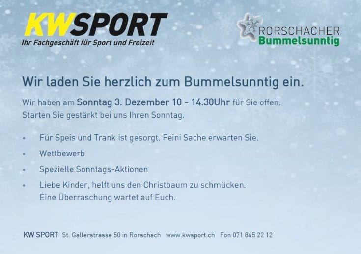 KW Sport ist fast am westlichsten Platz der Stadt daheim. Am heutigen Bummelsunntig hat das Rorschacher Fachgeschäft bereits ab 10 Uhr offen – inkl. Parkplätze direkt vor dem Laden.