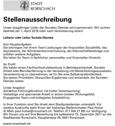 Paul Huber geht bald einmal in Pension. Deshalb sucht die Stadt Rorschach für die Sozialen Dienste eine neuen Leiterin oder einen neuen Leiter. Die Stellenausschreibung ist auch auf der Homepage der Stadt zu finden.
