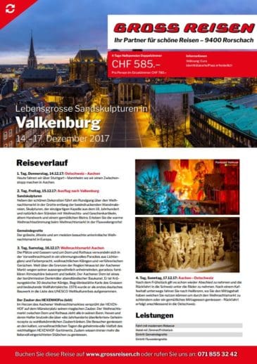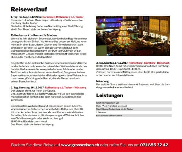 Am Donnerstag und Freitag gibt es gleich zwei mehrtägige Arrangements. Und den Rest kennt man ja: In Rorschach einsteigen – Reise geniessen – Weihnachtsmarkt bestaunen und am Schluss wieder bequem in Rorschach aussteigen.