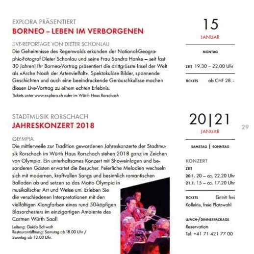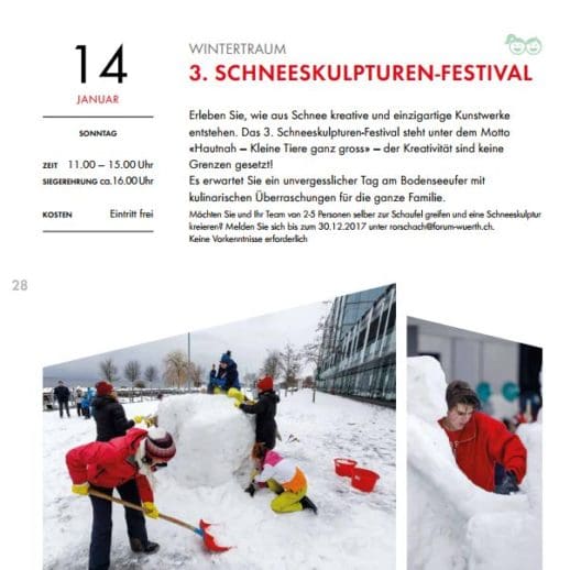 Viel Kunst und Kultur auch im Januar im Würth HausThemen:KulturRorschachWürth 29. Dezember 2017 - 05:11Mehr Infos findet man hier und hier. Wie bereits erwähnt ist der Anmeldeschluss für das Schneeskulpturen-Festival bereits morgen Samstag.Teilen mit: Einen Link per E-Mail an einen Freund senden (Wird in neuem Fenster geöffnet) E-Mail Drucken (Wird in neuem Fenster geöffnet) Drucken Auf Facebook teilen (Wird in neuem Fenster geöffnet) Facebook Auf X teilen (Wird in neuem Fenster geöffnet) X Auf WhatsApp teilen (Wird in neuem Fenster geöffnet) WhatsApp Gefällt mir:Gefällt mir Wird geladen …Newsletter abonnieren Bitte dieses Feld leer lassenBitte wähle, ob Du über jeden neuen Beitrag sofort oder lieber jeden Morgen gegen 9 Uhr eine Zusammenfassung der neusten Beiträge erhalten möchtest.Liste(n) auswählen: Neues vom Echo (Zusammenfassung) Neues vom Echo (Sofortbenachrichtigung) Dieses Feld wird benötigt.Prüfen Sie Ihren Posteingang und den Spamordner, um Ihr Abonnement zu bestätigen.