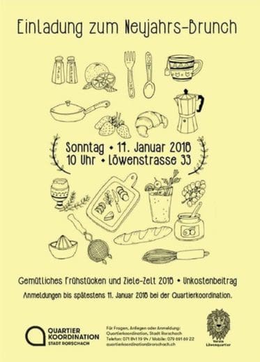 „Was wünschen Sie sich für die Rorschacher QuartierTreffs im neuen Jahr?“ Diese Frage will die Quartierkoordination Rorschach am Sonntag, 14. Januar 2018 ab 10 Uhr mit Interessierten diskutieren und auf das neue Jahr anstossen. Anmeldungen zum Neujahrsbrunch bis spätestens 11. Januar 2018 per Mail, Telefon > 071 841 19 94 und /oder 079 691 69 22, Whatsapp oder direkt an der Löwenstrasse 33. Öffnungszeiten: Mittwoch von 14 bis 17 Uhr, donnerstags von 17 bis 20 Uhr.