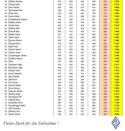 Das alte FCR-Jassturnier hat auch die Fusion überlebt. Nach 23 Durchführungen in den letzten Jahren war gestern der Neustart für den fusionierten Verein angesagt. 76 Jassbegeisterte haben sich in der Pesta-Clubhütte eingefunden und die Sieger ermittelt. Nach 56 Spielen standen die GewinnerInnen fest. Jasskönig wurde Thomas Hohl aus Rorschacherberg (Beitragsbild ganz oben links). Platz 2 ging an Bea Bischofberger und über den 3. Platz durfte sich Bruno Bless freuen. Unten findet man die Rangliste und oben einige Schnappschüsse.
