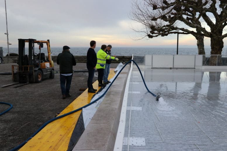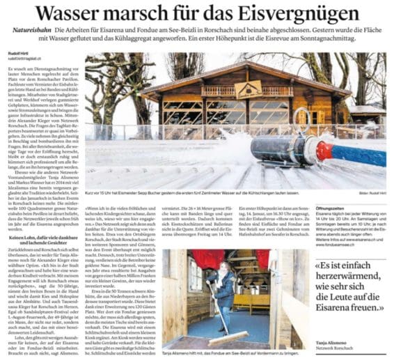 Gestern wurde termingerecht die Eisarena beim Pavillon mit Wasser geflutet. Für eine kompakte Eisfläche werden insgesamt rund 30 Kubikmeter Wasser benötigt. Hier Bilder von gestern Nachmittag. Das Tagblatt hat heute ebenfalls einen Bericht veröffentlicht. Am Freitag wird die Eisarena eröffnet, ebenso das Fonduebeizli.