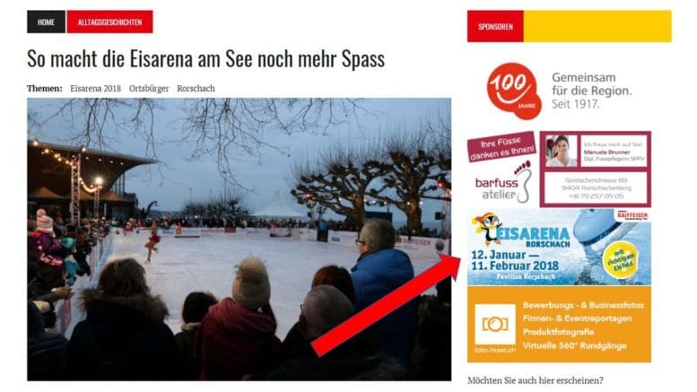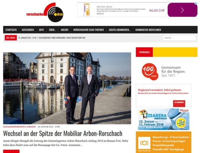 Gleich zwei neue Werbebanner zieren seit gestern die rechte Spalte auf diesem Portal. Indem man den Banner anklickt gelangt man auf die vom Kunden bestimmte Webseite. So kommt man ganz einfach in Kontakt mit den vielen Rorschacher Echo-LeserInnen. Herzlichen Dank für die Unterstützung.
