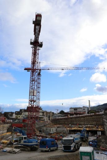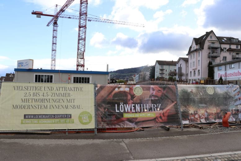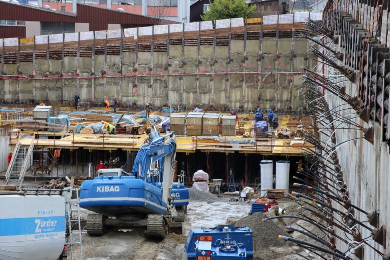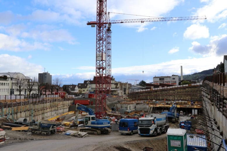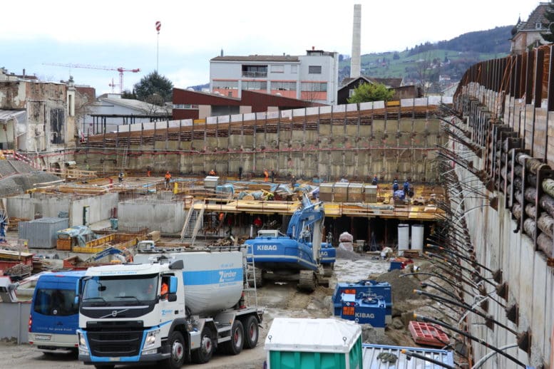 Auf dem Areal der ehemaligen Brauerei Löwengarten ist wieder rege Bautätigkeit wahrzunehmen. Da lohnt es sich, einmal von der Löwengartenstrasse aus einen Blick in die Baugrube zu werfen. Im nördlichen und westlichen Teil wurde in den letzten Tagen die Gitter mit einem Sichtschutz versehen.