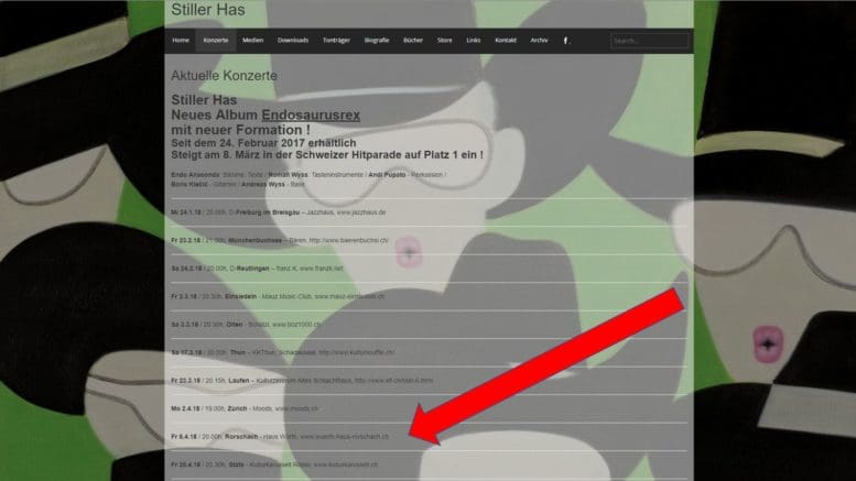 Stiller Has beehren uns am 6. April im Würth HausThemen:KulturRorschachWürth 28. Januar 2018 - 07:21Das wird einer dieser Abende geben, auf den man sich schon lange vorher so richtig freut. Infos zur Kultband gibt es hier, den Vorverkauf benutzen kann man hier. (Bilder: Homepage Stiller Has / Michael Schär)Teilen mit: Einen Link per E-Mail an einen Freund senden (Wird in neuem Fenster geöffnet) E-Mail Drucken (Wird in neuem Fenster geöffnet) Drucken Auf Facebook teilen (Wird in neuem Fenster geöffnet) Facebook Auf X teilen (Wird in neuem Fenster geöffnet) X Auf WhatsApp teilen (Wird in neuem Fenster geöffnet) WhatsApp Gefällt mir:Gefällt mir Wird geladen …Newsletter abonnieren Bitte dieses Feld leer lassenBitte wähle, ob Du über jeden neuen Beitrag sofort oder lieber jeden Morgen gegen 9 Uhr eine Zusammenfassung der neusten Beiträge erhalten möchtest.Liste(n) auswählen: Neues vom Echo (Zusammenfassung) Neues vom Echo (Sofortbenachrichtigung) Dieses Feld wird benötigt.Prüfen Sie Ihren Posteingang und den Spamordner, um Ihr Abonnement zu bestätigen.