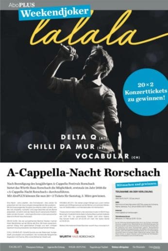 Das ganzseitige Inserat ist am Samstag im Tagblatt erschienen. Die Tickets kann man nur bis am kommenden Mittwoch, 14.02., 12 Uhr, gewinnen. Die 1. Rorschacher a-cappella-Nacht findet am Samstag, 3. März 2018, im Würth Haus Rorschach statt. Weitere Infos findet man hier.