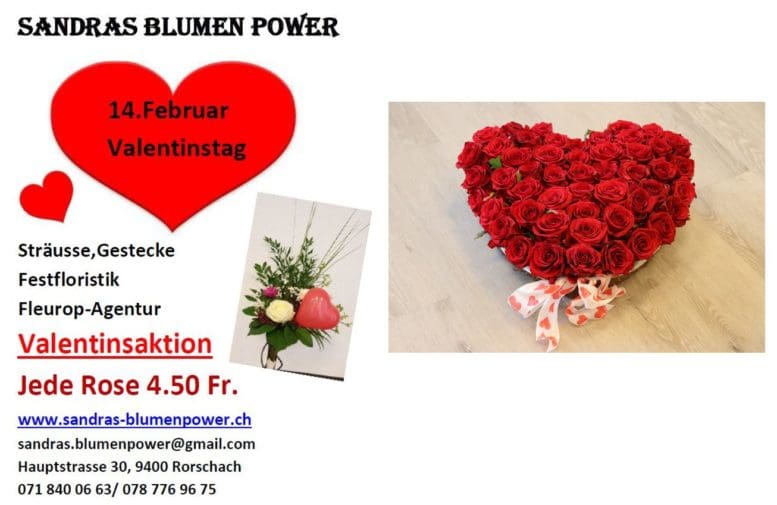 Der 14. Februar ist immer auch Valentinstag. Das bedeutet Hochbetrieb bei den Floristen – auch in Rorschach. Hier ein Hinweis für Sandras Blumen Power. Das Geschäft findet man an der Hauptstrasse 30 (ehemals Teppich Möckli, zwischen Zürich Versicherung und Polizeiposten). Morgen hat Sandras Blumen Power auch über Mittag offen.