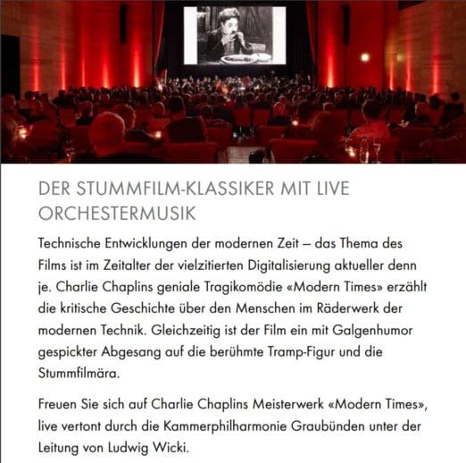 „Modern Times“ kennt heute noch fast jeder. Charlie Chaplin in einer seiner bekanntesten Rolle. Technische Entwicklungen der modernen Zeit — das Thema des Films ist im Zeitalter der vielzitierten Digitalisierung aktueller denn je. Charlie Chaplins geniale Tragikomödie «Modern Times» erzählt die kritische Geschichte über den Menschen im Räderwerk der modernen Technik. Gleichzeitig ist der Film ein mit Galgenhumor gespickter Abgesang auf die berühmte Tramp-Figur und die Stummfilmära. Der Film wird morgen Freitag, 23. Februar, ab 20 Uhr im Würth Haus in Rorschach gezeigt und live vor Ort durch die Kammerphilharmonie Graubünden vertont.