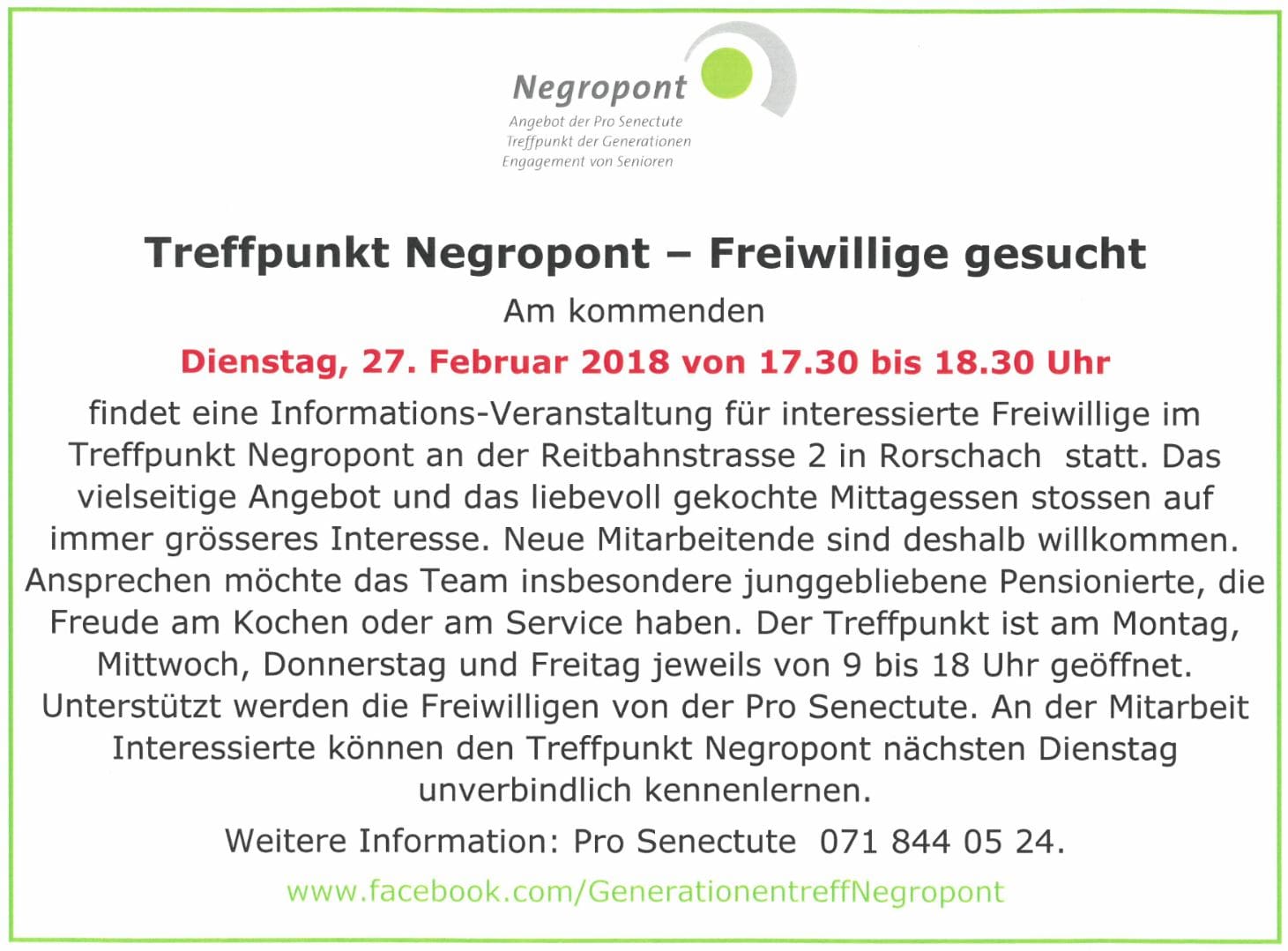 Negropont sucht MithelfendeThemen:BeizenRorschach 26. Februar 2018 - 05:11Morgen Dienstagnachmittag werden Interessierte im Negropont orientiert. Und die Küche wird diese Woche auch in Betrieb sein …Teilen mit: Einen Link per E-Mail an einen Freund senden (Wird in neuem Fenster geöffnet) E-Mail Drucken (Wird in neuem Fenster geöffnet) Drucken Auf Facebook teilen (Wird in neuem Fenster geöffnet) Facebook Auf X teilen (Wird in neuem Fenster geöffnet) X Auf WhatsApp teilen (Wird in neuem Fenster geöffnet) WhatsApp Gefällt mir:Gefällt mir Wird geladen …Newsletter abonnieren Bitte dieses Feld leer lassenBitte wähle, ob Du über jeden neuen Beitrag sofort oder lieber jeden Morgen gegen 9 Uhr eine Zusammenfassung der neusten Beiträge erhalten möchtest.Liste(n) auswählen: Neues vom Echo (Zusammenfassung) Neues vom Echo (Sofortbenachrichtigung) Dieses Feld wird benötigt.Prüfen Sie Ihren Posteingang und den Spamordner, um Ihr Abonnement zu bestätigen.