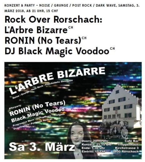Heute und morgen Konzerte im TreppenhausThemen:BeizenKulturRorschachTreppenhaus 2. März 2018 - 05:22Heute frischer Indie-Rock aus Belgien und morgen Rock over Rorschach. Detailinfos wie immer hier. Teilen mit: Einen Link per E-Mail an einen Freund senden (Wird in neuem Fenster geöffnet) E-Mail Drucken (Wird in neuem Fenster geöffnet) Drucken Auf Facebook teilen (Wird in neuem Fenster geöffnet) Facebook Auf X teilen (Wird in neuem Fenster geöffnet) X Auf WhatsApp teilen (Wird in neuem Fenster geöffnet) WhatsApp Gefällt mir:Gefällt mir Wird geladen …Newsletter abonnieren Bitte dieses Feld leer lassenBitte wähle, ob Du über jeden neuen Beitrag sofort oder lieber jeden Morgen gegen 9 Uhr eine Zusammenfassung der neusten Beiträge erhalten möchtest.Liste(n) auswählen: Neues vom Echo (Zusammenfassung) Neues vom Echo (Sofortbenachrichtigung) Dieses Feld wird benötigt.Prüfen Sie Ihren Posteingang und den Spamordner, um Ihr Abonnement zu bestätigen.