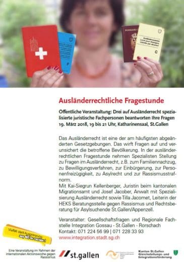 Vom 17. bis 25. März 2018 findet in verschiedenen Kantonen und Städten der Schweiz die Internationale Aktionswoche gegen Rassismus statt, so auch im Kanton St. Gallen. Die folgenden 3 Veranstaltungen in der Stadt St. Gallen sind empfehlenswert: