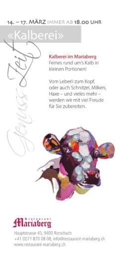 Apropos Mariaberg: Hier findet ab morgen Mittwoch eine weitere „Kalberei“ statt. Insider wissen: Feines rund um’s Kalb in kleinen Portionen. So wird das Schlemmen zum Erlebnis. Kalberei jeweils ab 18 Uhr. Über die Mittagszeit gibt es den normalen Menuservice.