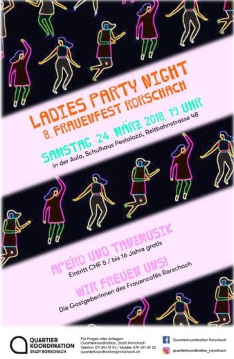 Das Frauencafé Rorschach lädt wieder zur Ladies Party Night ein. Das 8. Frauenfest in Rorschach findet am 24. März 2018 ab 19.00 Uhr in der Aula vom Schulhaus Pestalozzi, an der Reitbahnstrasse 48, in Rorschach statt. Der Eintritt kostet CHF 5 (bis 16 Jahre gratis). Die Initianten freuen sich auf einen fröhlichen Abend mit einem feinen Apéro und viel Tanzmusik. Für Fragen oder Anliegen: Quartierkoordination Stadt Rorschach, Löwenstrasse 33, Mail: quartierkoordination@rorschach.ch, Tel.: 071 841 19 94 / Mobil: 079 691 69 22. Man findet Informationen rund um die Quartierkoordination auch auf Facebook und Instagram.