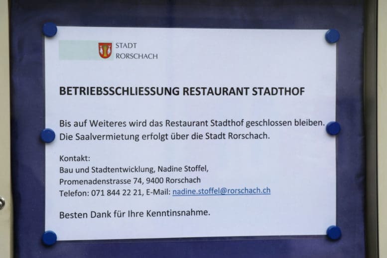 An der gestrigen Bürgerversammlung hat Stapi Thomas Müller auch die Situation rund um den Stadthof skizziert und bekannt gegeben, dass das Restaurant Stadthof bis auf Weiteres geschlossen bleiben dürfte. Wichtig ist aber zu wissen, dass die Saalvermietung jetzt über die Stadt Rorschach erfolgt. Interessierte können sich direkt mit Nadine Stoffel in Verbindung setzen.