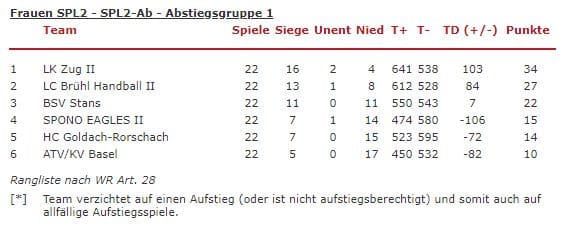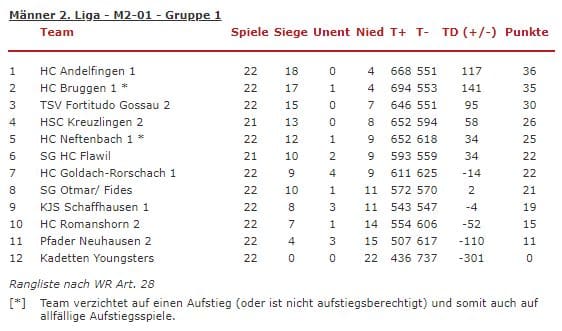 Saisonschluss bei den Herren 1 mit einer klaren 41:32 Auswärtsniederlage beim HC Bruggen. Auch die Damen 1 hatten beim Leader LK Ziug 2 mit 35:22 keine Chance. Da dürfte es am nächsten Sonntag um 16 Uhr in der Wartegghalle zum „Spiel der Spiele“ kommen: Die Damen 1 als Vorletzte empfangen das Tabellenschlusslicht ATV/KV Basel. Bei noch 2 verbleibenden Spielen und vier Punkten Vorsprung wohl der erste Matchball zum Ligaerhalt in der SPL 2.