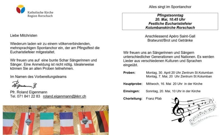 Wiederum laden die Initianten zu einem völkerverbindenden, mehrsprachigen Spontanchor ein, der am Pfingstfest am Sonntag, 20. Mai 2018, die Eucharistiefeier mitgestaltet. Das Vorbereitungsteam um Pfr. Roland Eigenmann freut sich auf eine bunte Schar Sängerinnen und Sänger. Eine Anmeldung ist nicht nötig. Idealerweise können Interessierte an allen Proben teilnehmen. Die Proben sind wie folgt angesetzt: Montag, 30. April 2018, 20 Uhr und Montag, 7. Mai 2018, 20 Uhr, jeweils im Zentrum St. Kolumban. Man freut sich über Sängerinnen und Sängern unterschiedlicher Generationen und Nationen. Es werden Lieder aus verschiedenen Kulturen und Sprachen eingeübt. Die Hauptprobe findet am Mittwoch, 16. Mai 2018, um 20 Uhr in der Kolumbanskirche statt. Der Spontanchor steht unter der Leitung von Franz Pfab.