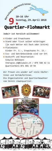 Ein paar Strassen weiter, auch heute Sonntag von 10 – 16 Uhr, der traditionelle Quartier-Flohmarkt an der Gerenstrasse. Zusammen mit verschiedenen Standanbietern organisiert der Verein Löwenquartier eine kunterbunte Auswahl an Raritäten, Kleidern, Spielsachen, Haushaltsgeräten, günstigen Schnäppchen, Sammelstücken und versteckten Schätzen. Auch spontane Standanbieter/innen sind willkommen.